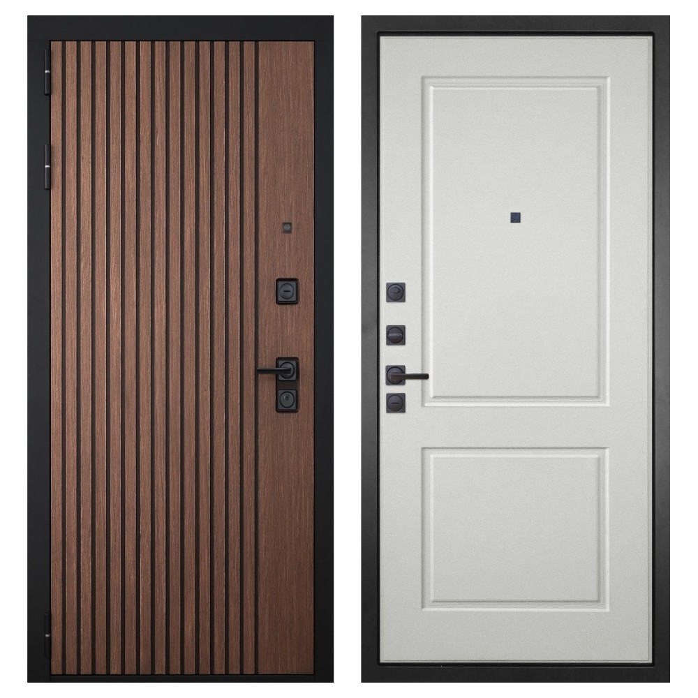 Дизайн и отделка: Металлическое полотно покрыто прочным полимерно-порошковым слоем цвета «Муар чёрный», устойчивым к износу и влаге. Внешняя МДФ-панель и наличники выполнены в цвете «Американский орех» с патиной, создавая благородный и тёплый внешний вид. Два объёмных хромированных логотипа подчеркивают фирменный стиль и премиальный уровень модели.