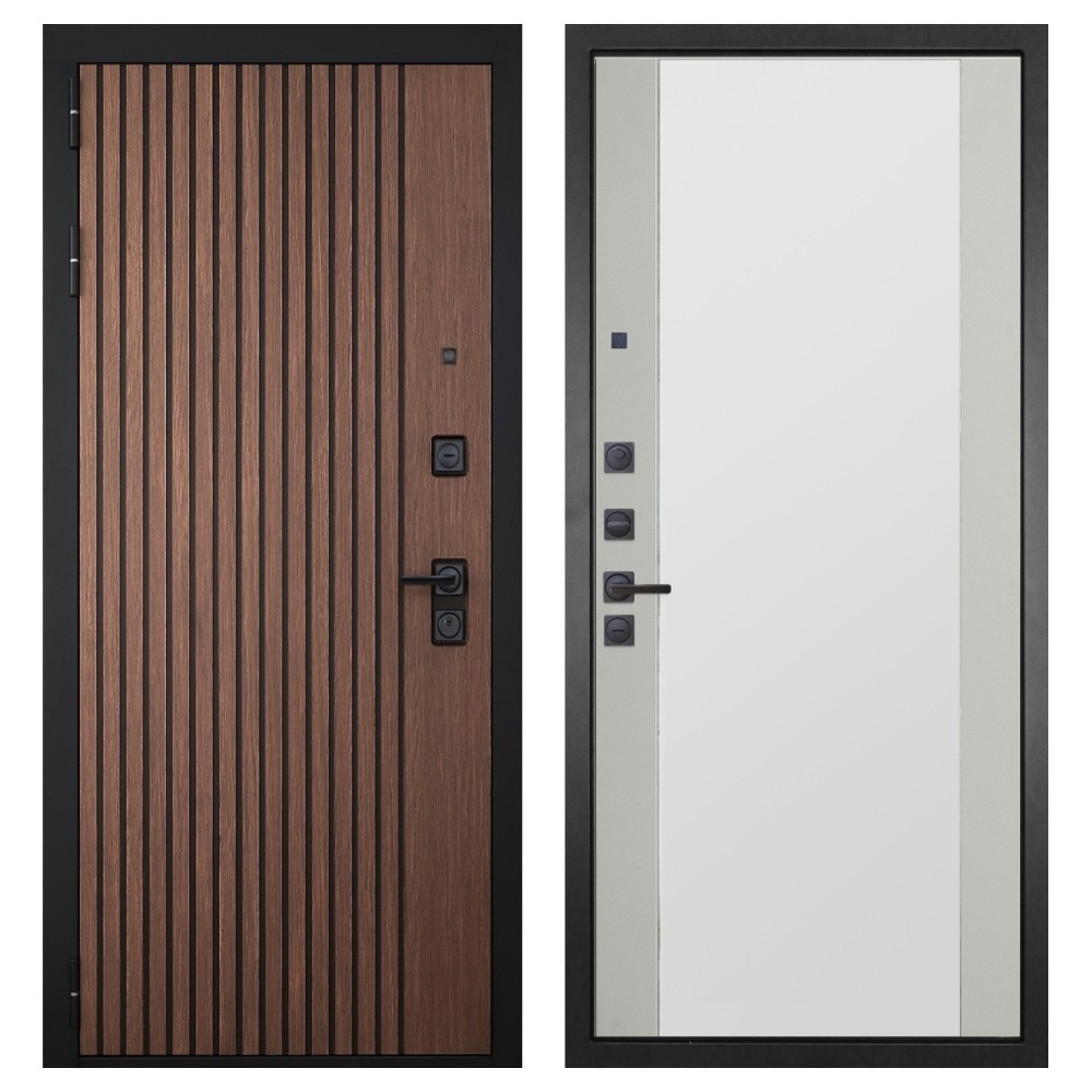 Дизайн и отделка: Металлическое полотно покрыто прочным полимерно-порошковым слоем цвета «Муар чёрный», устойчивым к износу и влаге. Внешняя МДФ-панель и наличники выполнены в цвете «Американский орех» с патиной, создавая благородный и тёплый внешний вид. Два объёмных хромированных логотипа подчеркивают фирменный стиль и премиальный уровень модели.