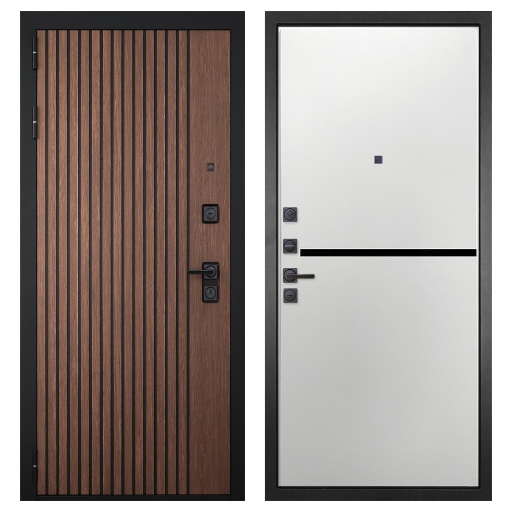 Дизайн и отделка: Металлическое полотно покрыто прочным полимерно-порошковым слоем цвета «Муар чёрный», устойчивым к износу и влаге. Внешняя МДФ-панель и наличники выполнены в цвете «Американский орех» с патиной, создавая благородный и тёплый внешний вид. Два объёмных хромированных логотипа подчеркивают фирменный стиль и премиальный уровень модели.