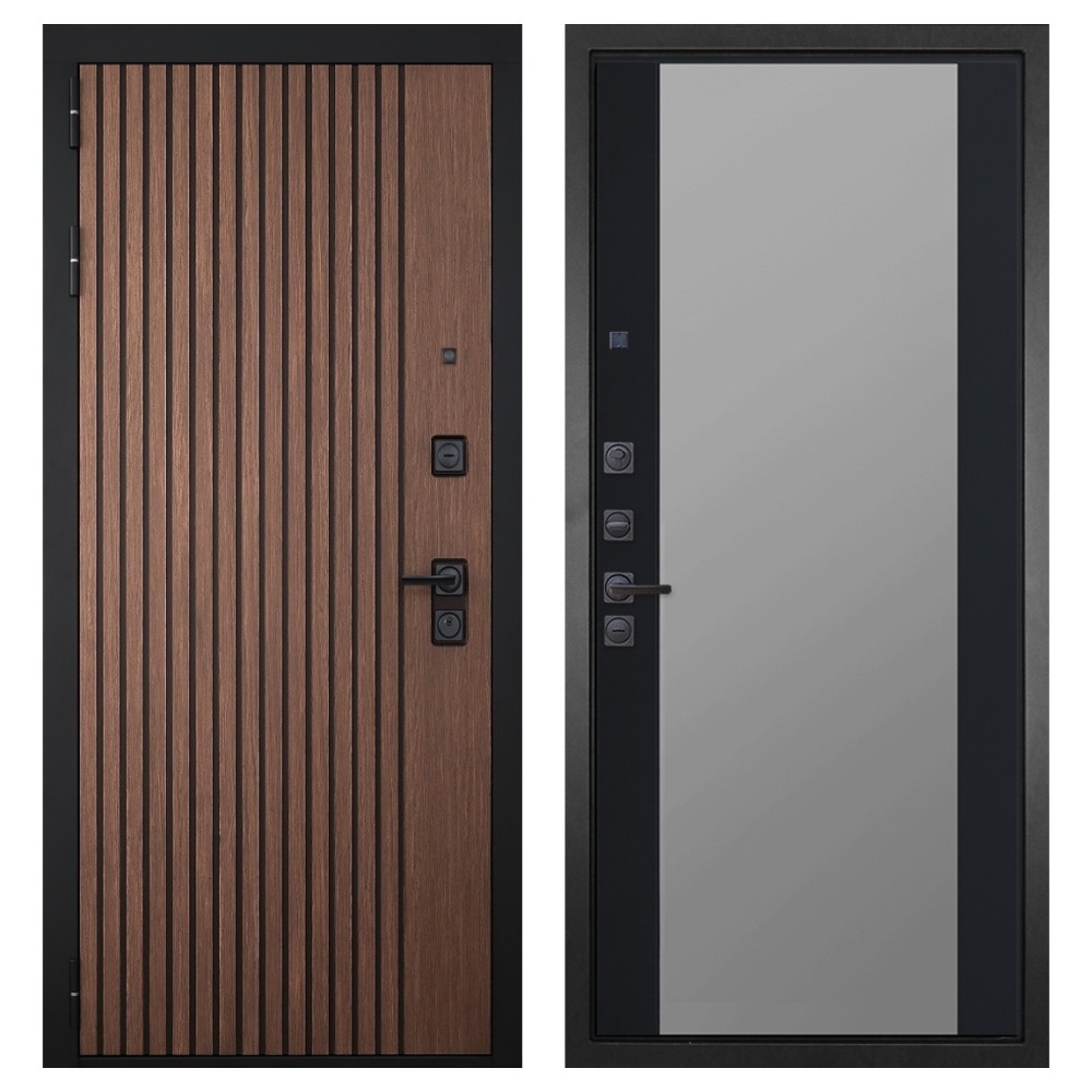 Дизайн и отделка: Металлическое полотно покрыто прочным полимерно-порошковым слоем цвета «Муар чёрный», устойчивым к износу и влаге. Внешняя МДФ-панель и наличники выполнены в цвете «Американский орех» с патиной, создавая благородный и тёплый внешний вид. Два объёмных хромированных логотипа подчеркивают фирменный стиль и премиальный уровень модели.