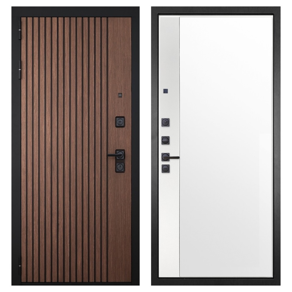 Дизайн и отделка: Металлическое полотно покрыто прочным полимерно-порошковым слоем цвета «Муар чёрный», устойчивым к износу и влаге. Внешняя МДФ-панель и наличники выполнены в цвете «Американский орех» с патиной, создавая благородный и тёплый внешний вид. Два объёмных хромированных логотипа подчеркивают фирменный стиль и премиальный уровень модели.
