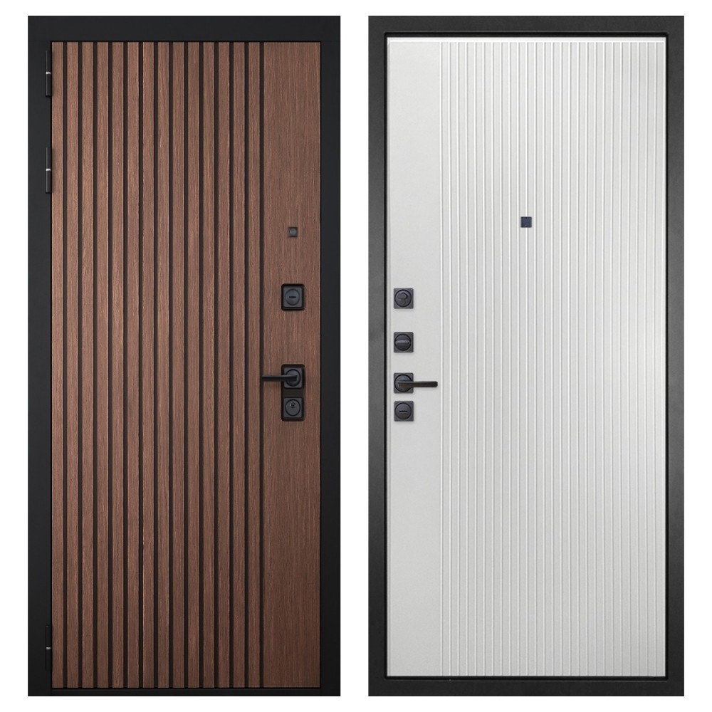 Дизайн и отделка: Металлическое полотно покрыто прочным полимерно-порошковым слоем цвета «Муар чёрный», устойчивым к износу и влаге. Внешняя МДФ-панель и наличники выполнены в цвете «Американский орех» с патиной, создавая благородный и тёплый внешний вид. Два объёмных хромированных логотипа подчеркивают фирменный стиль и премиальный уровень модели.