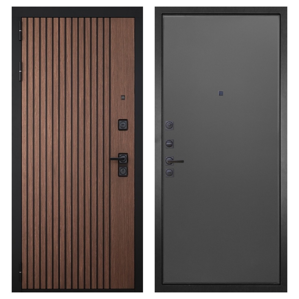 Дизайн и отделка: Металлическое полотно покрыто прочным полимерно-порошковым слоем цвета «Муар чёрный», устойчивым к износу и влаге. Внешняя МДФ-панель и наличники выполнены в цвете «Американский орех» с патиной, создавая благородный и тёплый внешний вид. Два объёмных хромированных логотипа подчеркивают фирменный стиль и премиальный уровень модели.