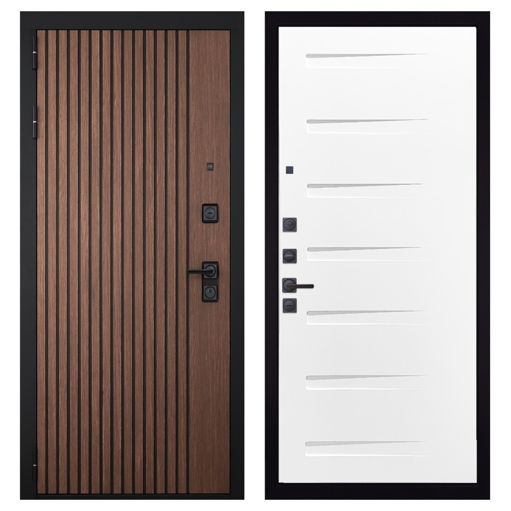 Дизайн и отделка: Металлическое полотно покрыто прочным полимерно-порошковым слоем цвета «Муар чёрный», устойчивым к износу и влаге. Внешняя МДФ-панель и наличники выполнены в цвете «Американский орех» с патиной, создавая благородный и тёплый внешний вид. Два объёмных хромированных логотипа подчеркивают фирменный стиль и премиальный уровень модели.