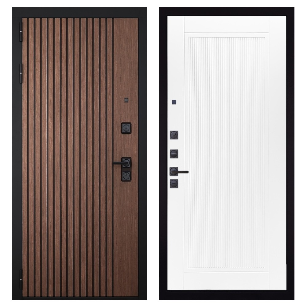 Дизайн и отделка: Металлическое полотно покрыто прочным полимерно-порошковым слоем цвета «Муар чёрный», устойчивым к износу и влаге. Внешняя МДФ-панель и наличники выполнены в цвете «Американский орех» с патиной, создавая благородный и тёплый внешний вид. Два объёмных хромированных логотипа подчеркивают фирменный стиль и премиальный уровень модели.
