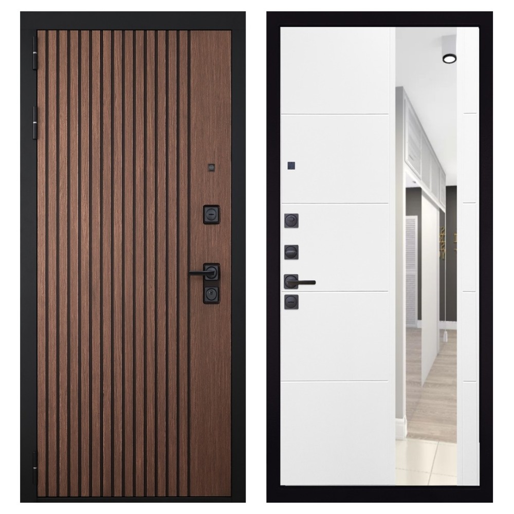 Дизайн и отделка: Металлическое полотно покрыто прочным полимерно-порошковым слоем цвета «Муар чёрный», устойчивым к износу и влаге. Внешняя МДФ-панель и наличники выполнены в цвете «Американский орех» с патиной, создавая благородный и тёплый внешний вид. Два объёмных хромированных логотипа подчеркивают фирменный стиль и премиальный уровень модели.