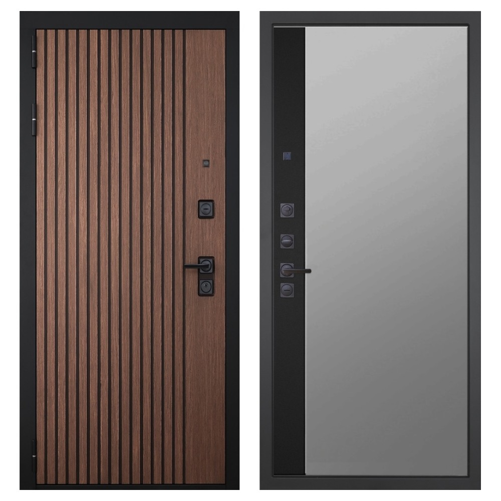 Дизайн и отделка: Металлическое полотно покрыто прочным полимерно-порошковым слоем цвета «Муар чёрный», устойчивым к износу и влаге. Внешняя МДФ-панель и наличники выполнены в цвете «Американский орех» с патиной, создавая благородный и тёплый внешний вид. Два объёмных хромированных логотипа подчеркивают фирменный стиль и премиальный уровень модели.