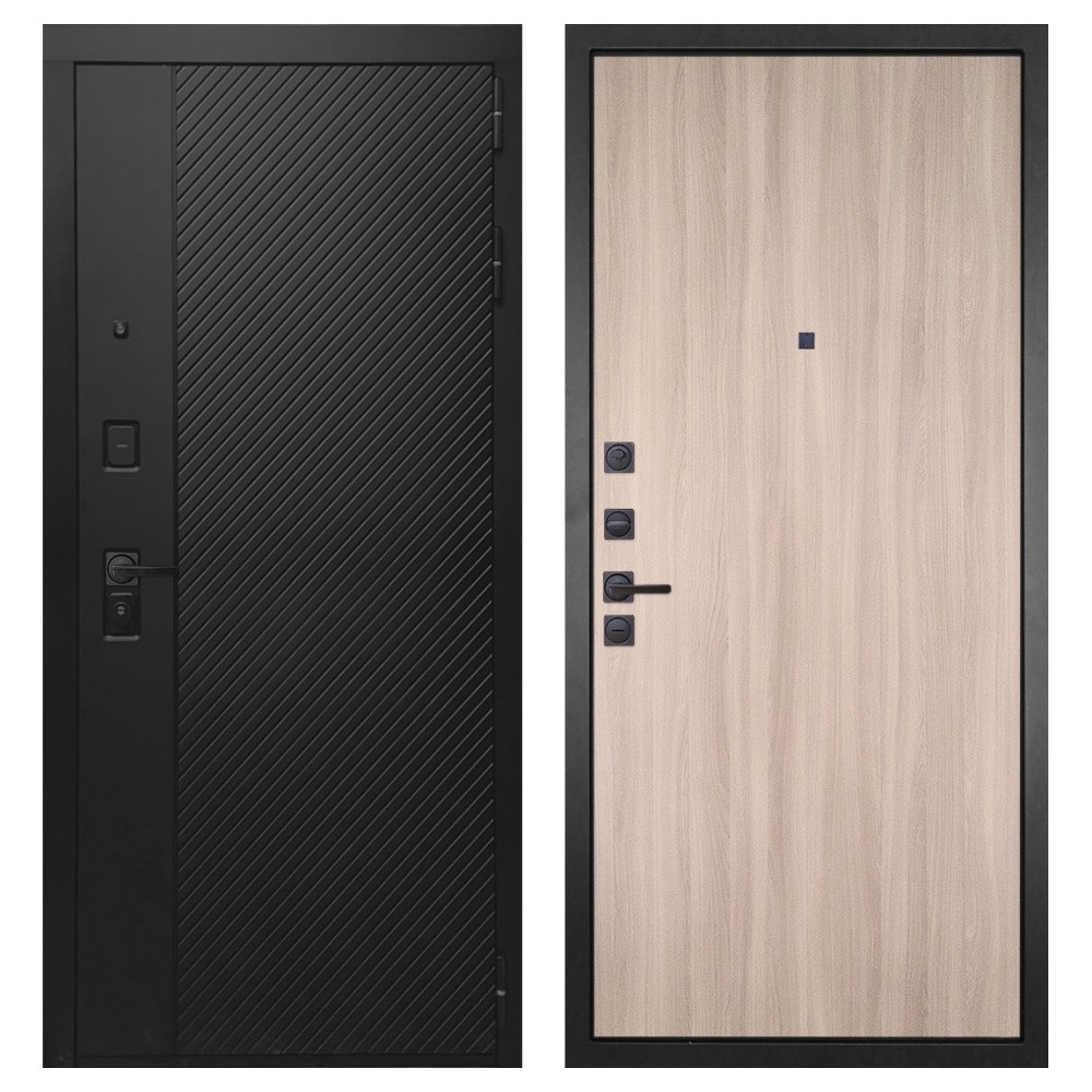 Дизайн и отделка: Конструкция выполнена из прочной стали с толщиной полотна 110–126 мм и окрашена износостойким полимерно-порошковым покрытием. Хромированный логотип и МДФ-наличники придают двери аккуратный и современный вид. Чёрная квадратная фурнитура подчёркивает строгий дизайн и универсальность модели.