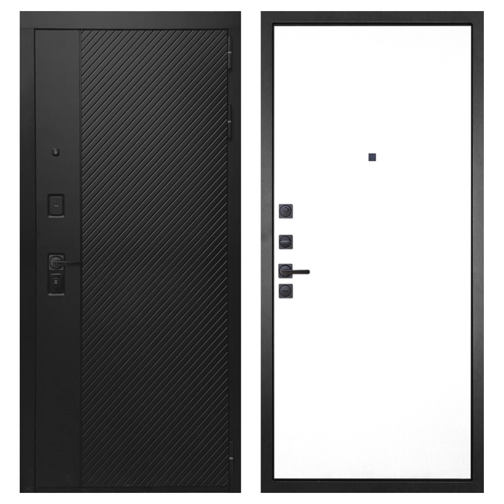 Дизайн и отделка: Конструкция выполнена из прочной стали с толщиной полотна 110–126 мм и окрашена износостойким полимерно-порошковым покрытием. Хромированный логотип и МДФ-наличники придают двери аккуратный и современный вид. Чёрная квадратная фурнитура подчёркивает строгий дизайн и универсальность модели.