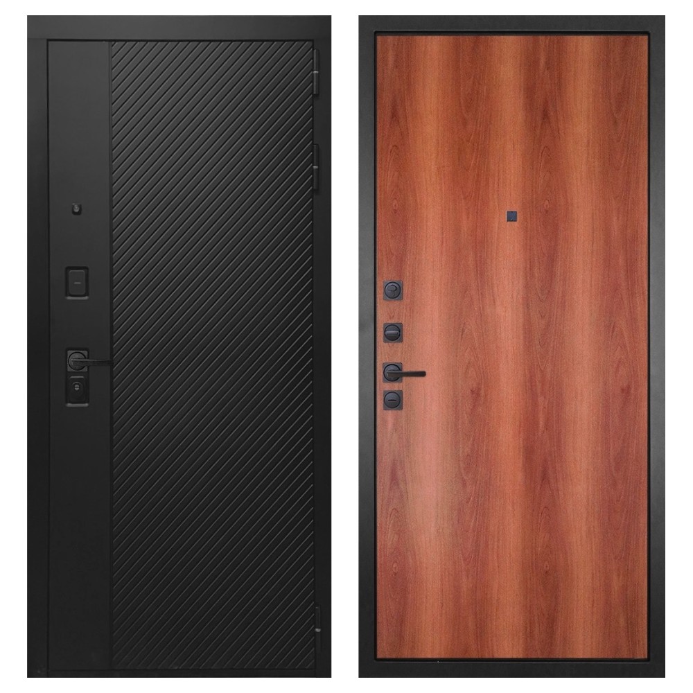 Дизайн и отделка: Конструкция выполнена из прочной стали с толщиной полотна 110–126 мм и окрашена износостойким полимерно-порошковым покрытием. Хромированный логотип и МДФ-наличники придают двери аккуратный и современный вид. Чёрная квадратная фурнитура подчёркивает строгий дизайн и универсальность модели.