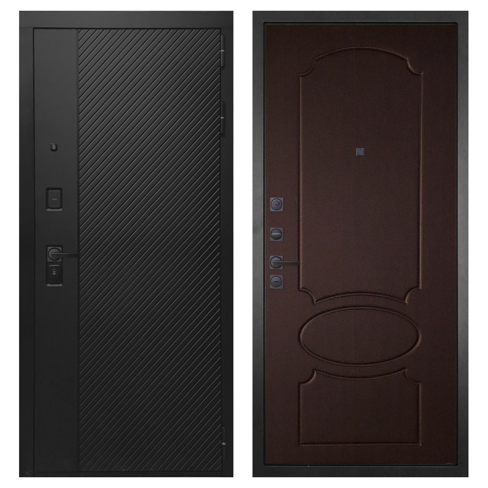 Дизайн и отделка: Конструкция выполнена из прочной стали с толщиной полотна 110–126 мм и окрашена износостойким полимерно-порошковым покрытием. Хромированный логотип и МДФ-наличники придают двери аккуратный и современный вид. Чёрная квадратная фурнитура подчёркивает строгий дизайн и универсальность модели.