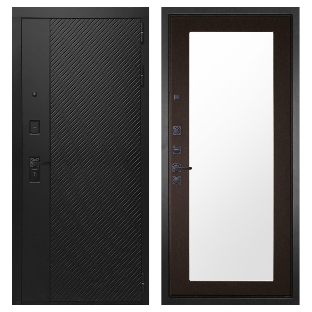 Дизайн и отделка: Конструкция выполнена из прочной стали с толщиной полотна 110–126 мм и окрашена износостойким полимерно-порошковым покрытием. Хромированный логотип и МДФ-наличники придают двери аккуратный и современный вид. Чёрная квадратная фурнитура подчёркивает строгий дизайн и универсальность модели.