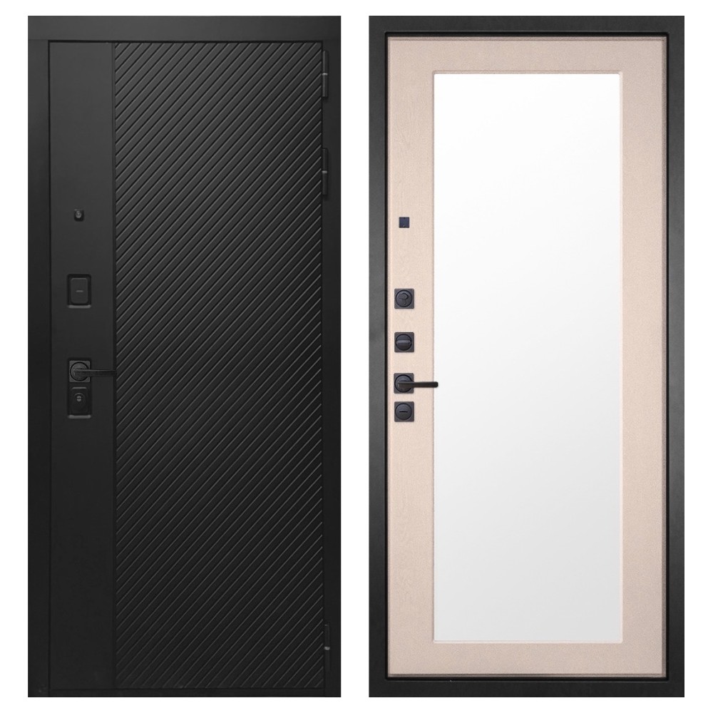 Дизайн и отделка: Конструкция выполнена из прочной стали с толщиной полотна 110–126 мм и окрашена износостойким полимерно-порошковым покрытием. Хромированный логотип и МДФ-наличники придают двери аккуратный и современный вид. Чёрная квадратная фурнитура подчёркивает строгий дизайн и универсальность модели.