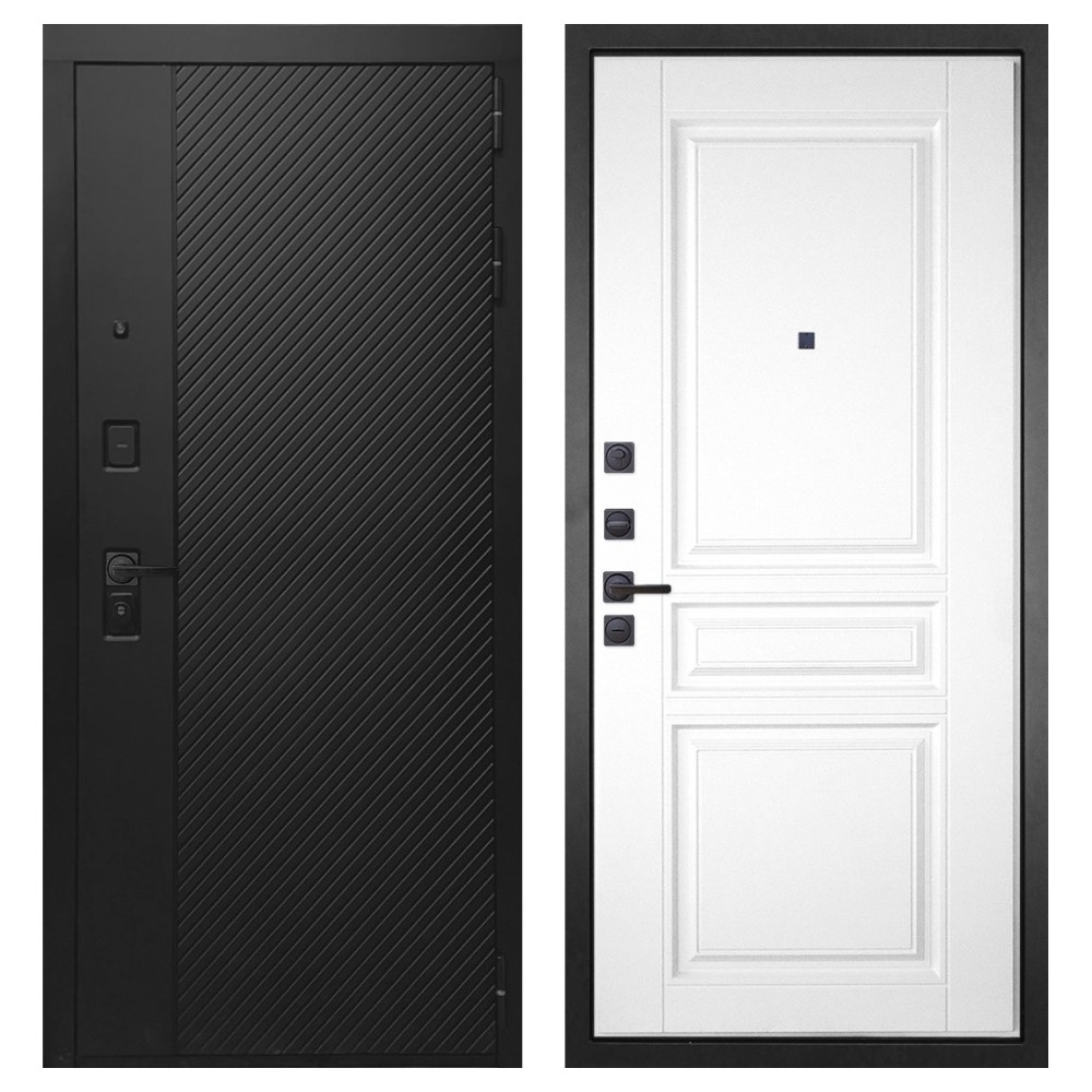 Дизайн и отделка: Конструкция выполнена из прочной стали с толщиной полотна 110–126 мм и окрашена износостойким полимерно-порошковым покрытием. Хромированный логотип и МДФ-наличники придают двери аккуратный и современный вид. Чёрная квадратная фурнитура подчёркивает строгий дизайн и универсальность модели.