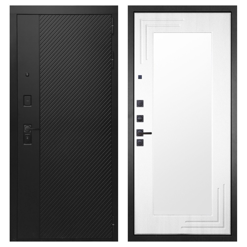 Дизайн и отделка: Конструкция выполнена из прочной стали с толщиной полотна 110–126 мм и окрашена износостойким полимерно-порошковым покрытием. Хромированный логотип и МДФ-наличники придают двери аккуратный и современный вид. Чёрная квадратная фурнитура подчёркивает строгий дизайн и универсальность модели.