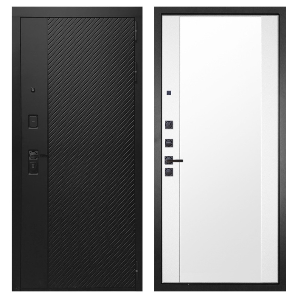 Дизайн и отделка: Конструкция выполнена из прочной стали с толщиной полотна 110–126 мм и окрашена износостойким полимерно-порошковым покрытием. Хромированный логотип и МДФ-наличники придают двери аккуратный и современный вид. Чёрная квадратная фурнитура подчёркивает строгий дизайн и универсальность модели.
