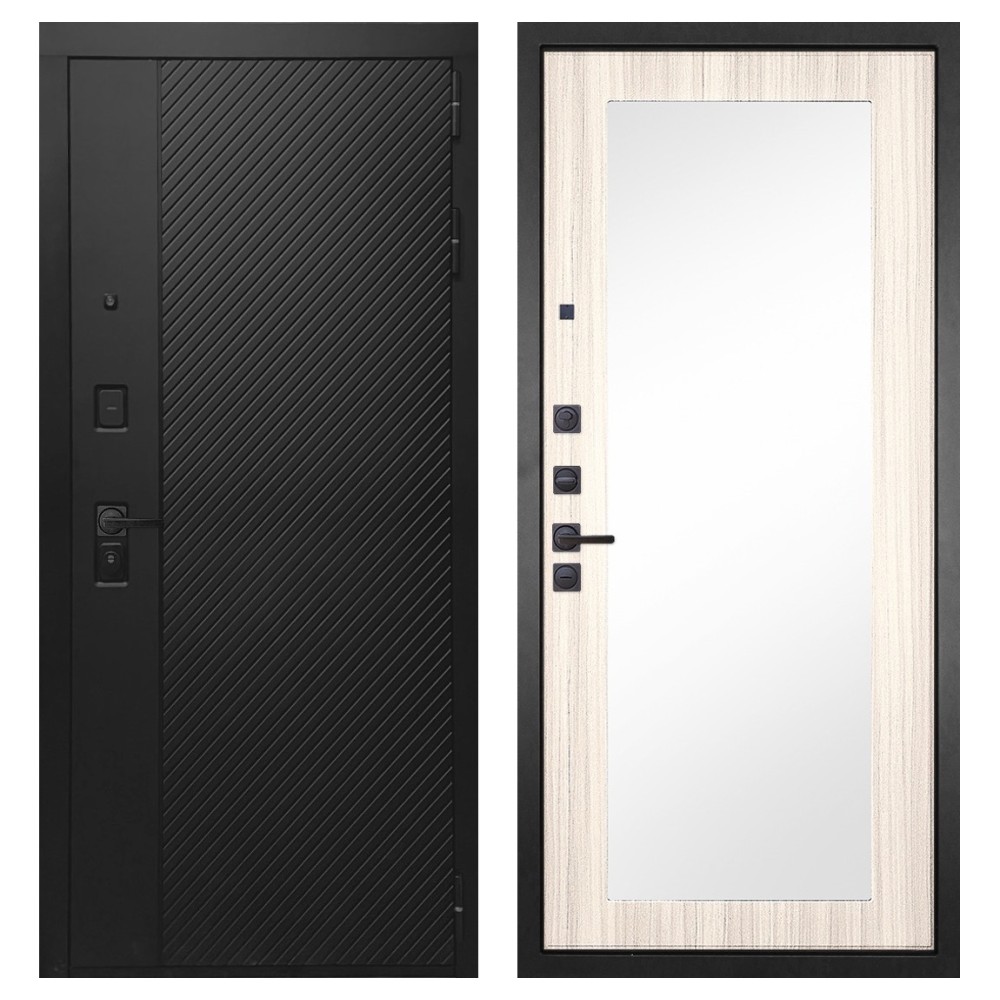 Дизайн и отделка: Конструкция выполнена из прочной стали с толщиной полотна 110–126 мм и окрашена износостойким полимерно-порошковым покрытием. Хромированный логотип и МДФ-наличники придают двери аккуратный и современный вид. Чёрная квадратная фурнитура подчёркивает строгий дизайн и универсальность модели.