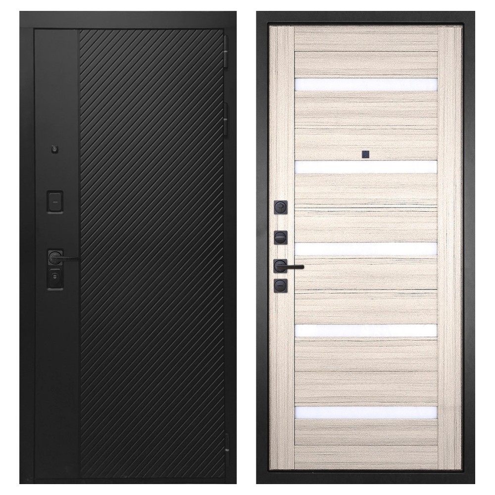 Дизайн и отделка: Конструкция выполнена из прочной стали с толщиной полотна 110–126 мм и окрашена износостойким полимерно-порошковым покрытием. Хромированный логотип и МДФ-наличники придают двери аккуратный и современный вид. Чёрная квадратная фурнитура подчёркивает строгий дизайн и универсальность модели.