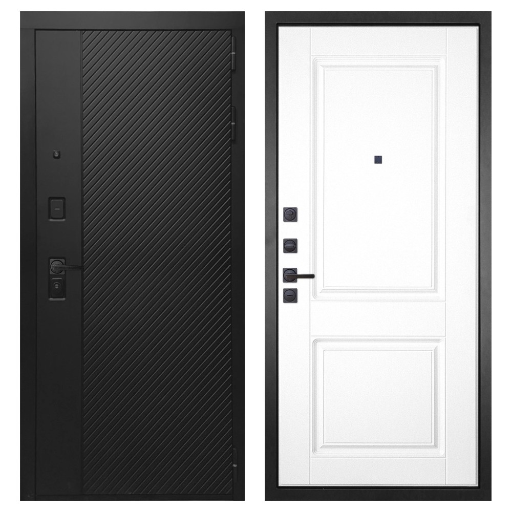 Дизайн и отделка: Конструкция выполнена из прочной стали с толщиной полотна 110–126 мм и окрашена износостойким полимерно-порошковым покрытием. Хромированный логотип и МДФ-наличники придают двери аккуратный и современный вид. Чёрная квадратная фурнитура подчёркивает строгий дизайн и универсальность модели.