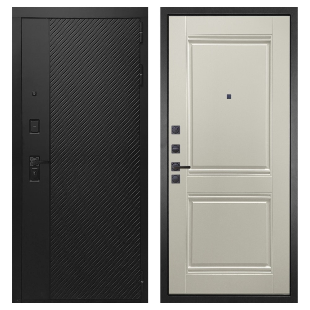 Дизайн и отделка: Конструкция выполнена из прочной стали с толщиной полотна 110–126 мм и окрашена износостойким полимерно-порошковым покрытием. Хромированный логотип и МДФ-наличники придают двери аккуратный и современный вид. Чёрная квадратная фурнитура подчёркивает строгий дизайн и универсальность модели.