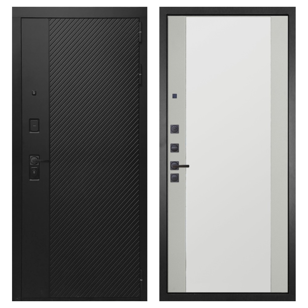 Дизайн и отделка: Конструкция выполнена из прочной стали с толщиной полотна 110–126 мм и окрашена износостойким полимерно-порошковым покрытием. Хромированный логотип и МДФ-наличники придают двери аккуратный и современный вид. Чёрная квадратная фурнитура подчёркивает строгий дизайн и универсальность модели.