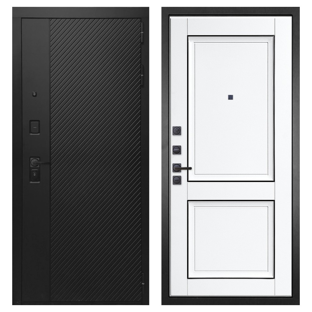 Дизайн и отделка: Конструкция выполнена из прочной стали с толщиной полотна 110–126 мм и окрашена износостойким полимерно-порошковым покрытием. Хромированный логотип и МДФ-наличники придают двери аккуратный и современный вид. Чёрная квадратная фурнитура подчёркивает строгий дизайн и универсальность модели.