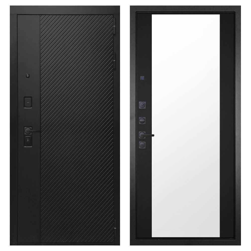 Дизайн и отделка: Конструкция выполнена из прочной стали с толщиной полотна 110–126 мм и окрашена износостойким полимерно-порошковым покрытием. Хромированный логотип и МДФ-наличники придают двери аккуратный и современный вид. Чёрная квадратная фурнитура подчёркивает строгий дизайн и универсальность модели.