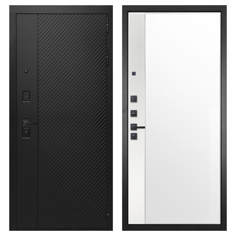 Дизайн и отделка: Конструкция выполнена из прочной стали с толщиной полотна 110–126 мм и окрашена износостойким полимерно-порошковым покрытием. Хромированный логотип и МДФ-наличники придают двери аккуратный и современный вид. Чёрная квадратная фурнитура подчёркивает строгий дизайн и универсальность модели.