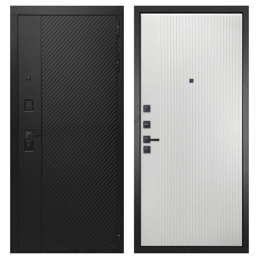 Дизайн и отделка: Конструкция выполнена из прочной стали с толщиной полотна 110–126 мм и окрашена износостойким полимерно-порошковым покрытием. Хромированный логотип и МДФ-наличники придают двери аккуратный и современный вид. Чёрная квадратная фурнитура подчёркивает строгий дизайн и универсальность модели.