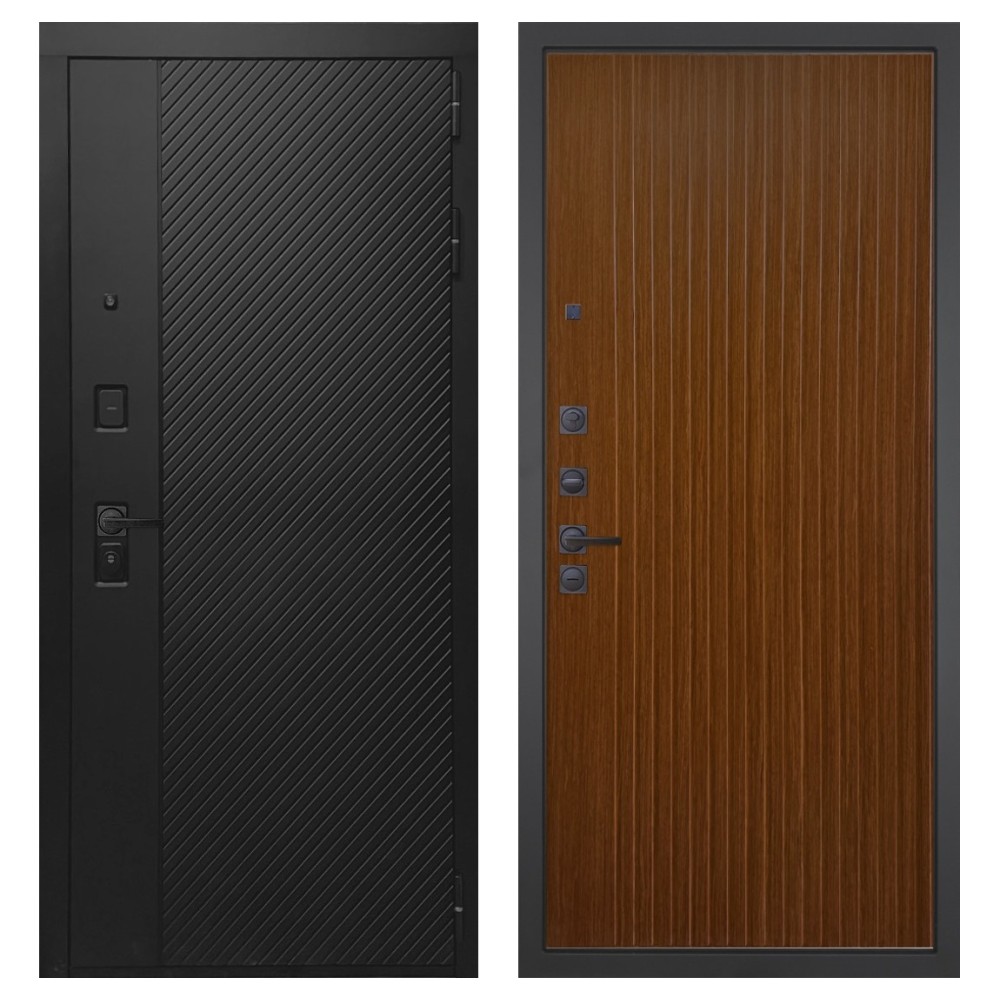 Дизайн и отделка: Конструкция выполнена из прочной стали с толщиной полотна 110–126 мм и окрашена износостойким полимерно-порошковым покрытием. Хромированный логотип и МДФ-наличники придают двери аккуратный и современный вид. Чёрная квадратная фурнитура подчёркивает строгий дизайн и универсальность модели.