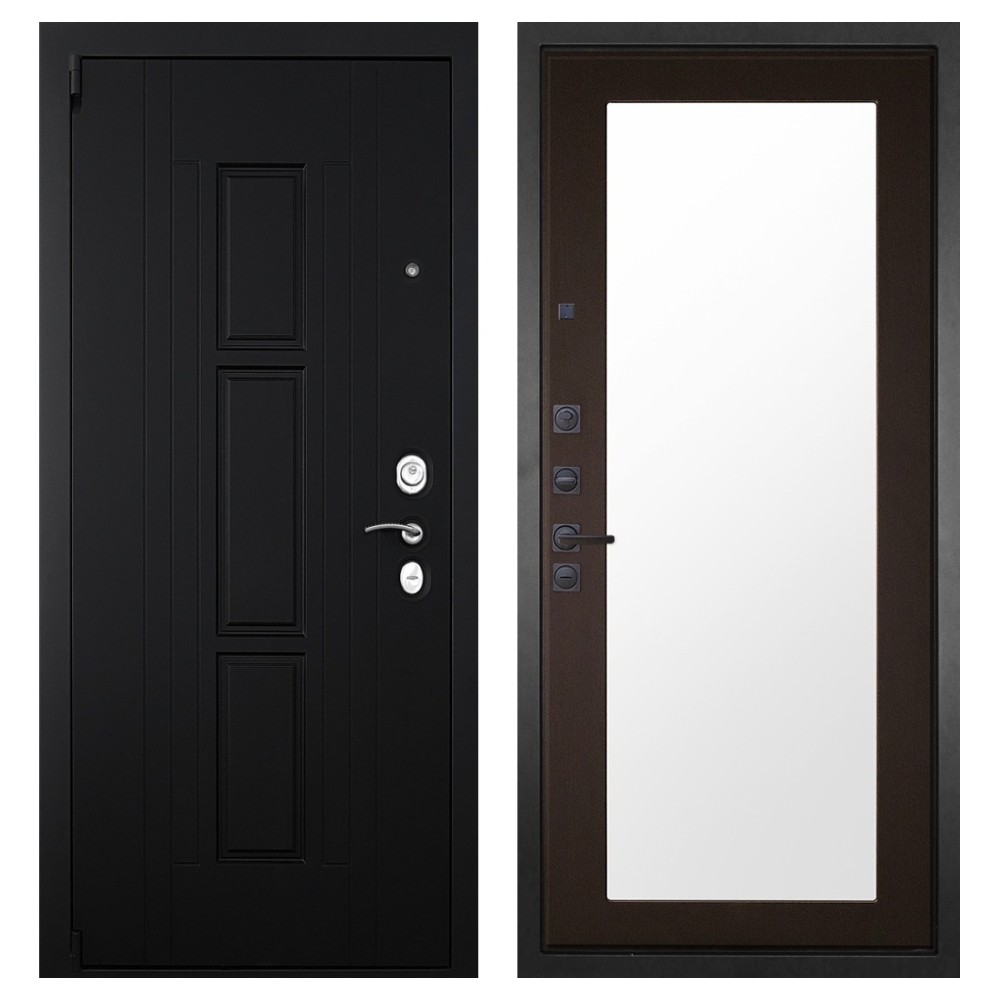 Дизайн и отделка: Металлическая конструкция покрыта прочным полимерно-порошковым слоем цвета «Муар чёрный». Внешняя МДФ-панель «Шагрень чёрная» толщиной 16 мм придаёт двери лаконичный и строгий вид, а два объёмных хромированных логотипа подчёркивают фирменный стиль бренда.