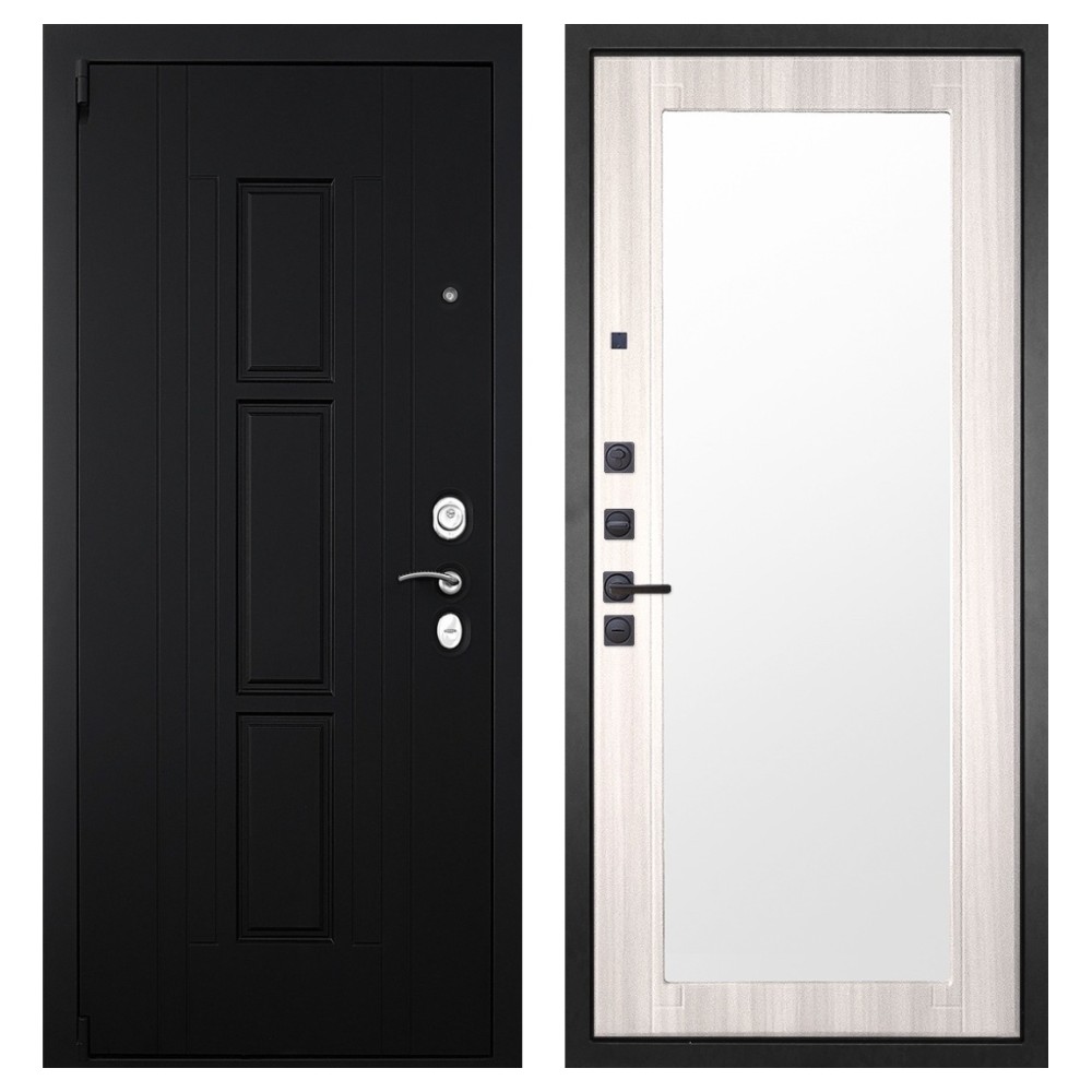 Дизайн и отделка: Металлическая конструкция покрыта прочным полимерно-порошковым слоем цвета «Муар чёрный». Внешняя МДФ-панель «Шагрень чёрная» толщиной 16 мм придаёт двери лаконичный и строгий вид, а два объёмных хромированных логотипа подчёркивают фирменный стиль бренда.