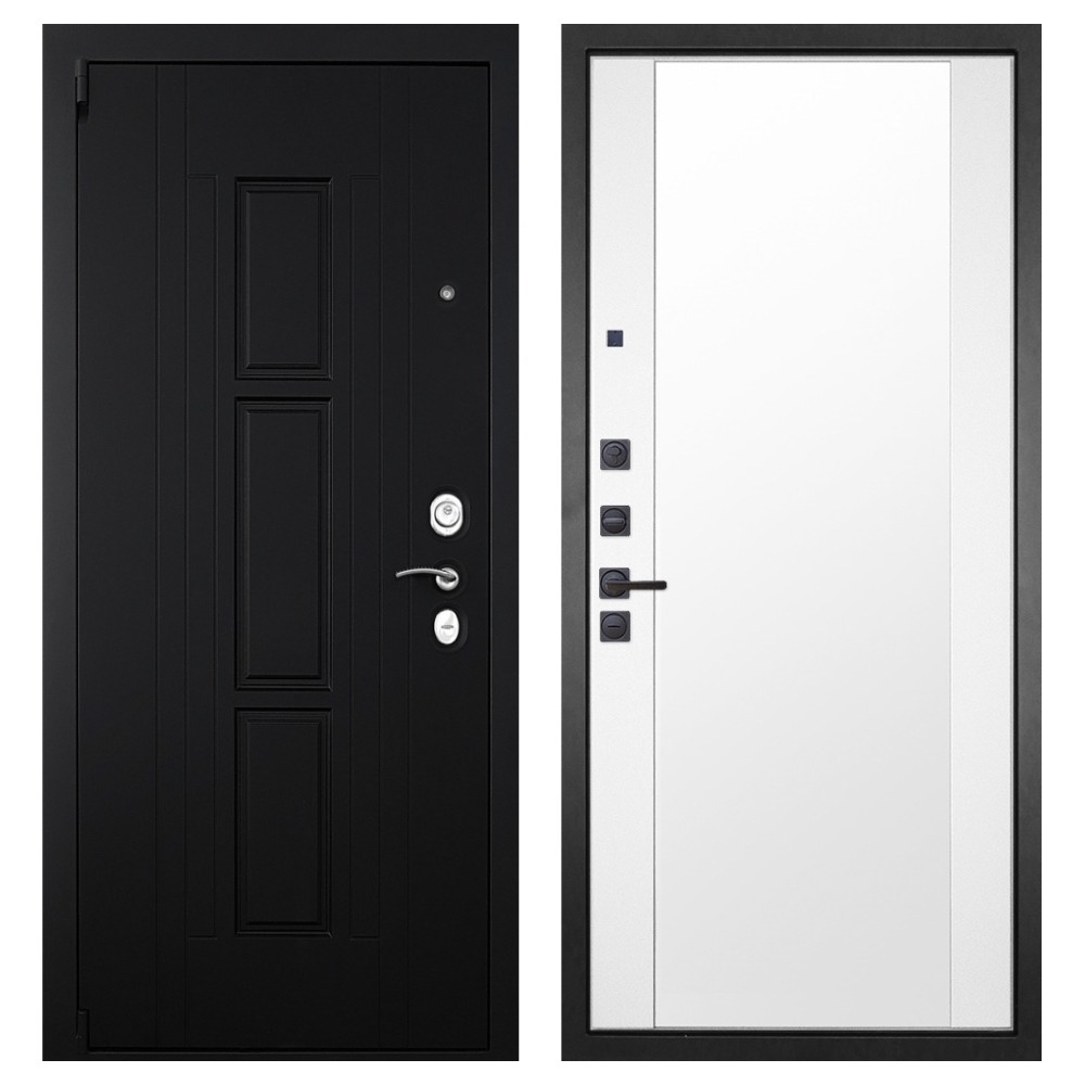 Дизайн и отделка: Металлическая конструкция покрыта прочным полимерно-порошковым слоем цвета «Муар чёрный». Внешняя МДФ-панель «Шагрень чёрная» толщиной 16 мм придаёт двери лаконичный и строгий вид, а два объёмных хромированных логотипа подчёркивают фирменный стиль бренда.