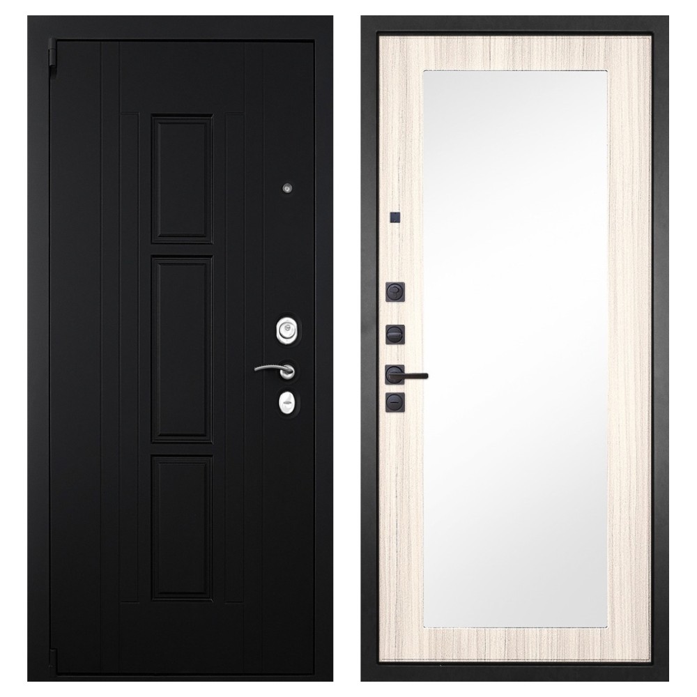 Дизайн и отделка: Металлическая конструкция покрыта прочным полимерно-порошковым слоем цвета «Муар чёрный». Внешняя МДФ-панель «Шагрень чёрная» толщиной 16 мм придаёт двери лаконичный и строгий вид, а два объёмных хромированных логотипа подчёркивают фирменный стиль бренда.
