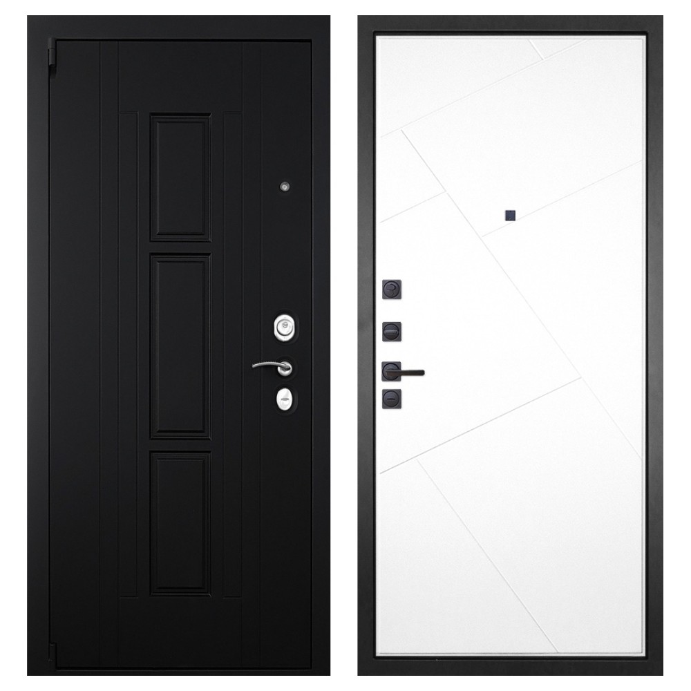 Дизайн и отделка: Металлическая конструкция покрыта прочным полимерно-порошковым слоем цвета «Муар чёрный». Внешняя МДФ-панель «Шагрень чёрная» толщиной 16 мм придаёт двери лаконичный и строгий вид, а два объёмных хромированных логотипа подчёркивают фирменный стиль бренда.
