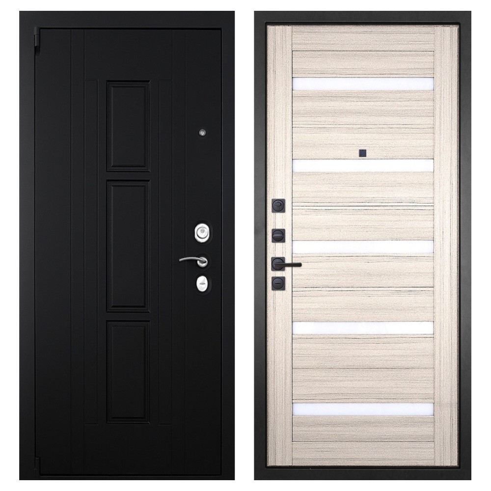 Дизайн и отделка: Металлическая конструкция покрыта прочным полимерно-порошковым слоем цвета «Муар чёрный». Внешняя МДФ-панель «Шагрень чёрная» толщиной 16 мм придаёт двери лаконичный и строгий вид, а два объёмных хромированных логотипа подчёркивают фирменный стиль бренда.