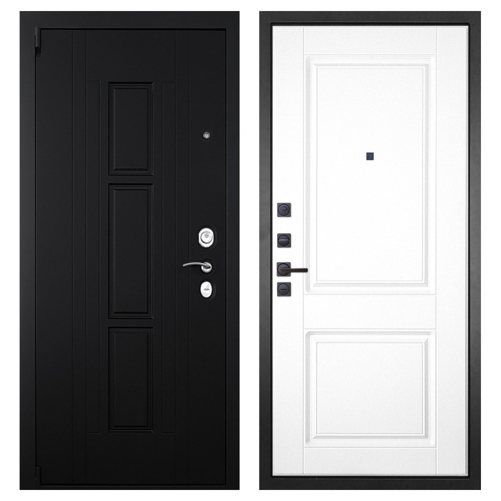Дизайн и отделка: Металлическая конструкция покрыта прочным полимерно-порошковым слоем цвета «Муар чёрный». Внешняя МДФ-панель «Шагрень чёрная» толщиной 16 мм придаёт двери лаконичный и строгий вид, а два объёмных хромированных логотипа подчёркивают фирменный стиль бренда.