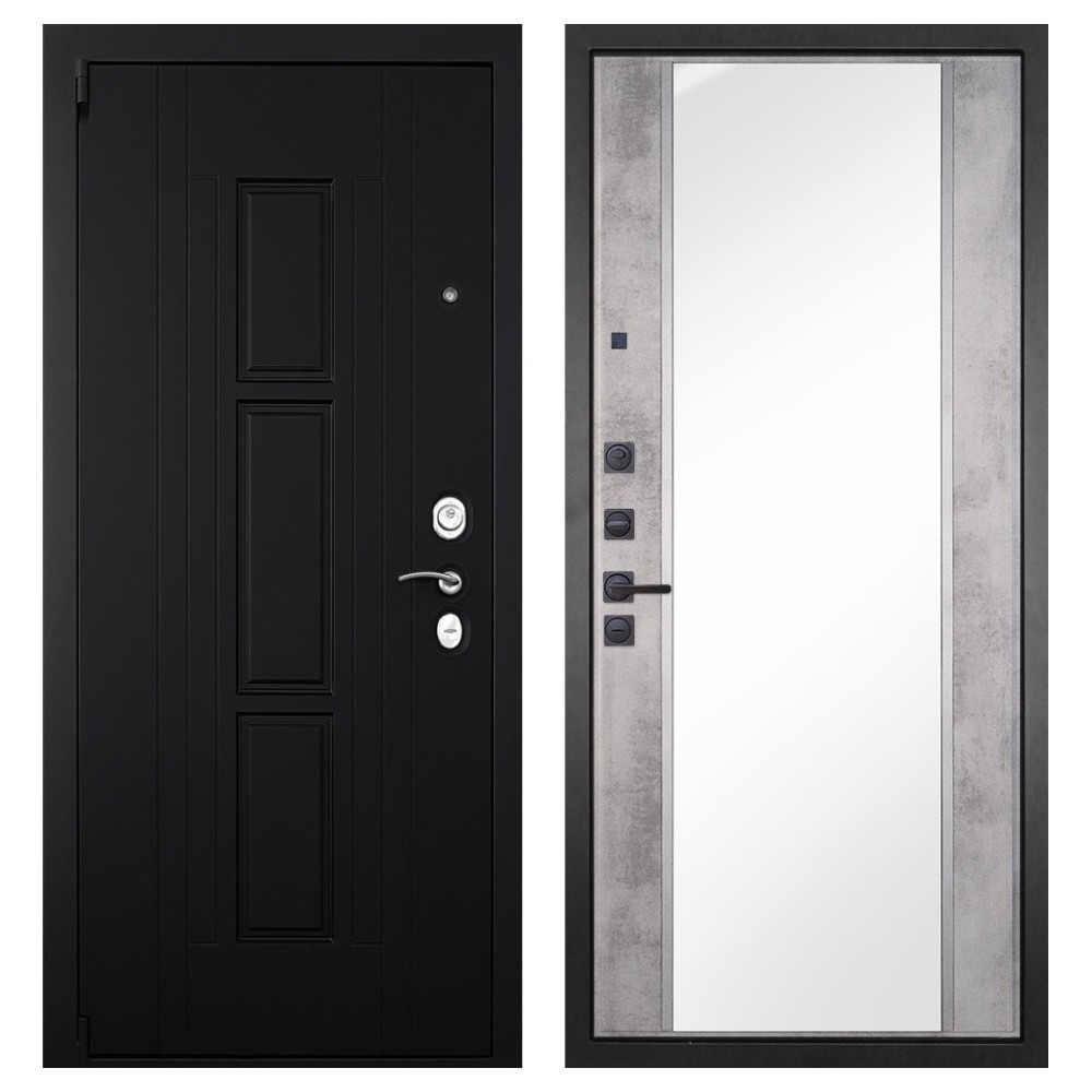 Дизайн и отделка: Металлическая конструкция покрыта прочным полимерно-порошковым слоем цвета «Муар чёрный». Внешняя МДФ-панель «Шагрень чёрная» толщиной 16 мм придаёт двери лаконичный и строгий вид, а два объёмных хромированных логотипа подчёркивают фирменный стиль бренда.
