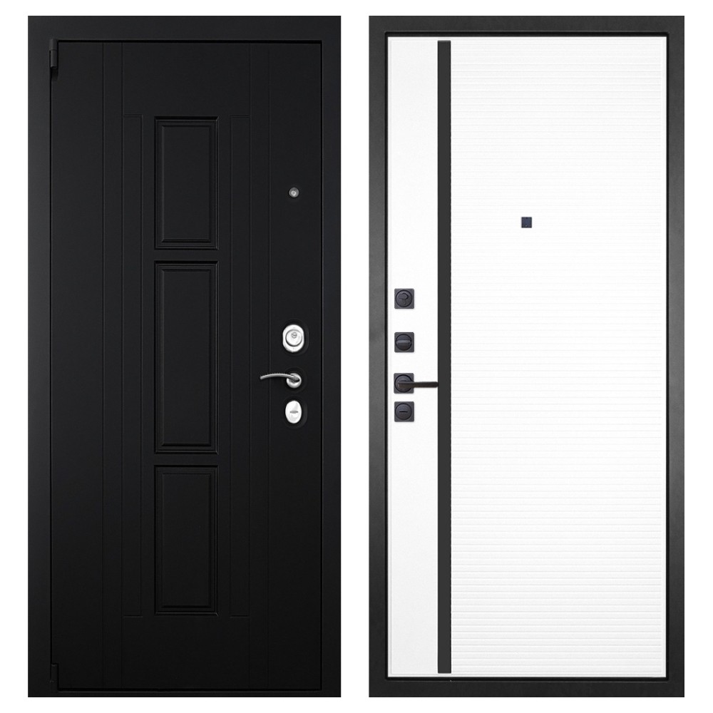 Дизайн и отделка: Металлическая конструкция покрыта прочным полимерно-порошковым слоем цвета «Муар чёрный». Внешняя МДФ-панель «Шагрень чёрная» толщиной 16 мм придаёт двери лаконичный и строгий вид, а два объёмных хромированных логотипа подчёркивают фирменный стиль бренда.