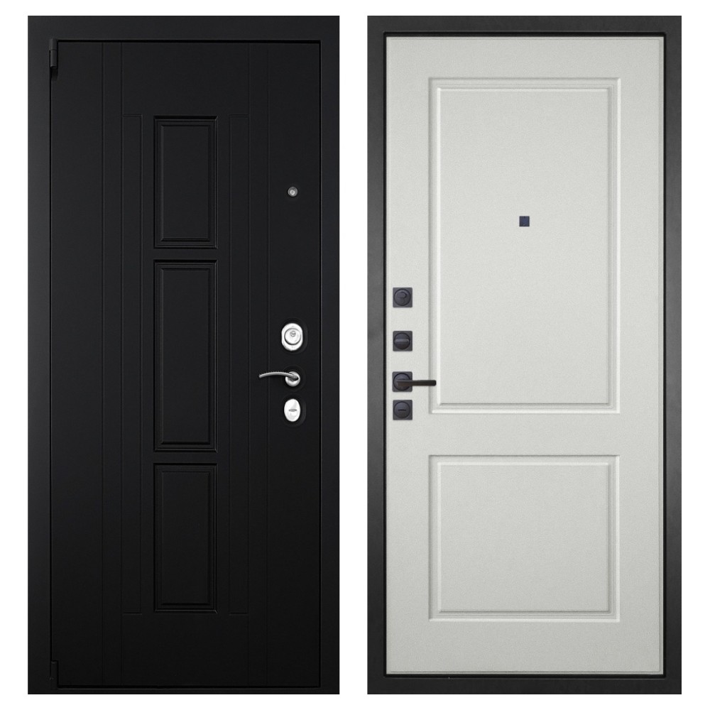 Дизайн и отделка: Металлическая конструкция покрыта прочным полимерно-порошковым слоем цвета «Муар чёрный». Внешняя МДФ-панель «Шагрень чёрная» толщиной 16 мм придаёт двери лаконичный и строгий вид, а два объёмных хромированных логотипа подчёркивают фирменный стиль бренда.