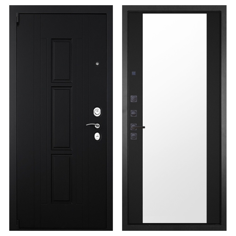 Дизайн и отделка: Металлическая конструкция покрыта прочным полимерно-порошковым слоем цвета «Муар чёрный». Внешняя МДФ-панель «Шагрень чёрная» толщиной 16 мм придаёт двери лаконичный и строгий вид, а два объёмных хромированных логотипа подчёркивают фирменный стиль бренда.
