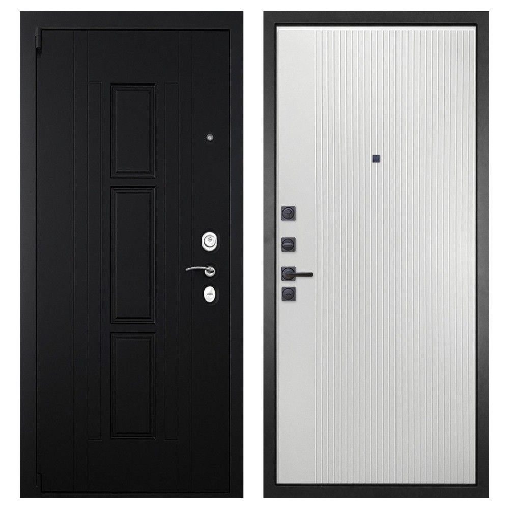 Дизайн и отделка: Металлическая конструкция покрыта прочным полимерно-порошковым слоем цвета «Муар чёрный». Внешняя МДФ-панель «Шагрень чёрная» толщиной 16 мм придаёт двери лаконичный и строгий вид, а два объёмных хромированных логотипа подчёркивают фирменный стиль бренда.