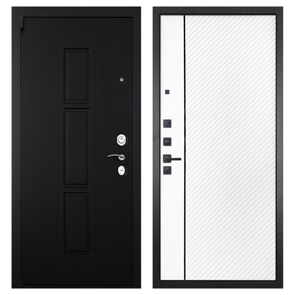 Дизайн и отделка: Металлическая конструкция покрыта прочным полимерно-порошковым слоем цвета «Муар чёрный». Внешняя МДФ-панель «Шагрень чёрная» толщиной 16 мм придаёт двери лаконичный и строгий вид, а два объёмных хромированных логотипа подчёркивают фирменный стиль бренда.