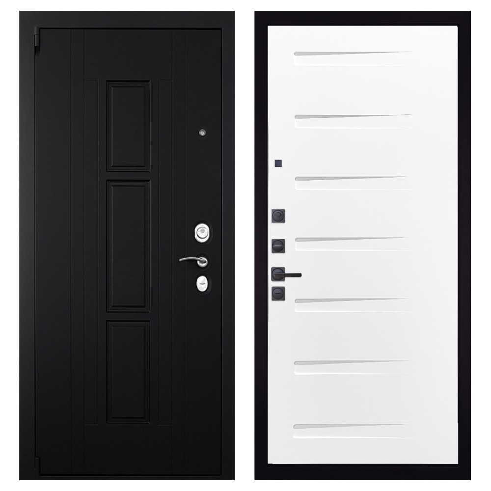 Дизайн и отделка: Металлическая конструкция покрыта прочным полимерно-порошковым слоем цвета «Муар чёрный». Внешняя МДФ-панель «Шагрень чёрная» толщиной 16 мм придаёт двери лаконичный и строгий вид, а два объёмных хромированных логотипа подчёркивают фирменный стиль бренда.