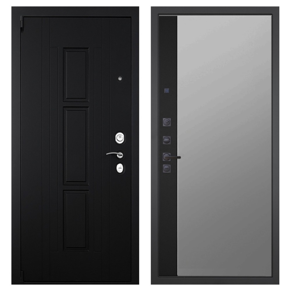 Дизайн и отделка: Металлическая конструкция покрыта прочным полимерно-порошковым слоем цвета «Муар чёрный». Внешняя МДФ-панель «Шагрень чёрная» толщиной 16 мм придаёт двери лаконичный и строгий вид, а два объёмных хромированных логотипа подчёркивают фирменный стиль бренда.