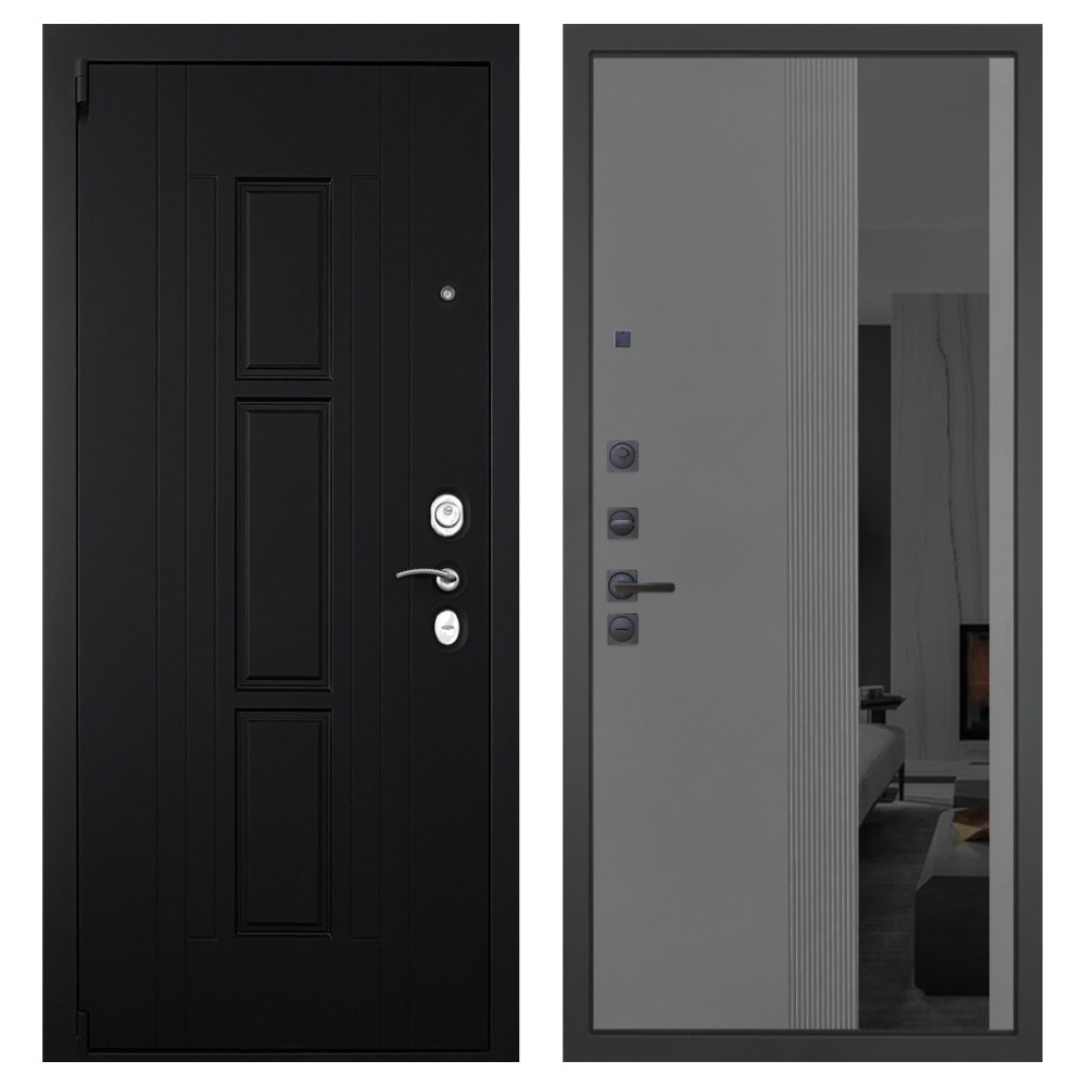Дизайн и отделка: Металлическая конструкция покрыта прочным полимерно-порошковым слоем цвета «Муар чёрный». Внешняя МДФ-панель «Шагрень чёрная» толщиной 16 мм придаёт двери лаконичный и строгий вид, а два объёмных хромированных логотипа подчёркивают фирменный стиль бренда.