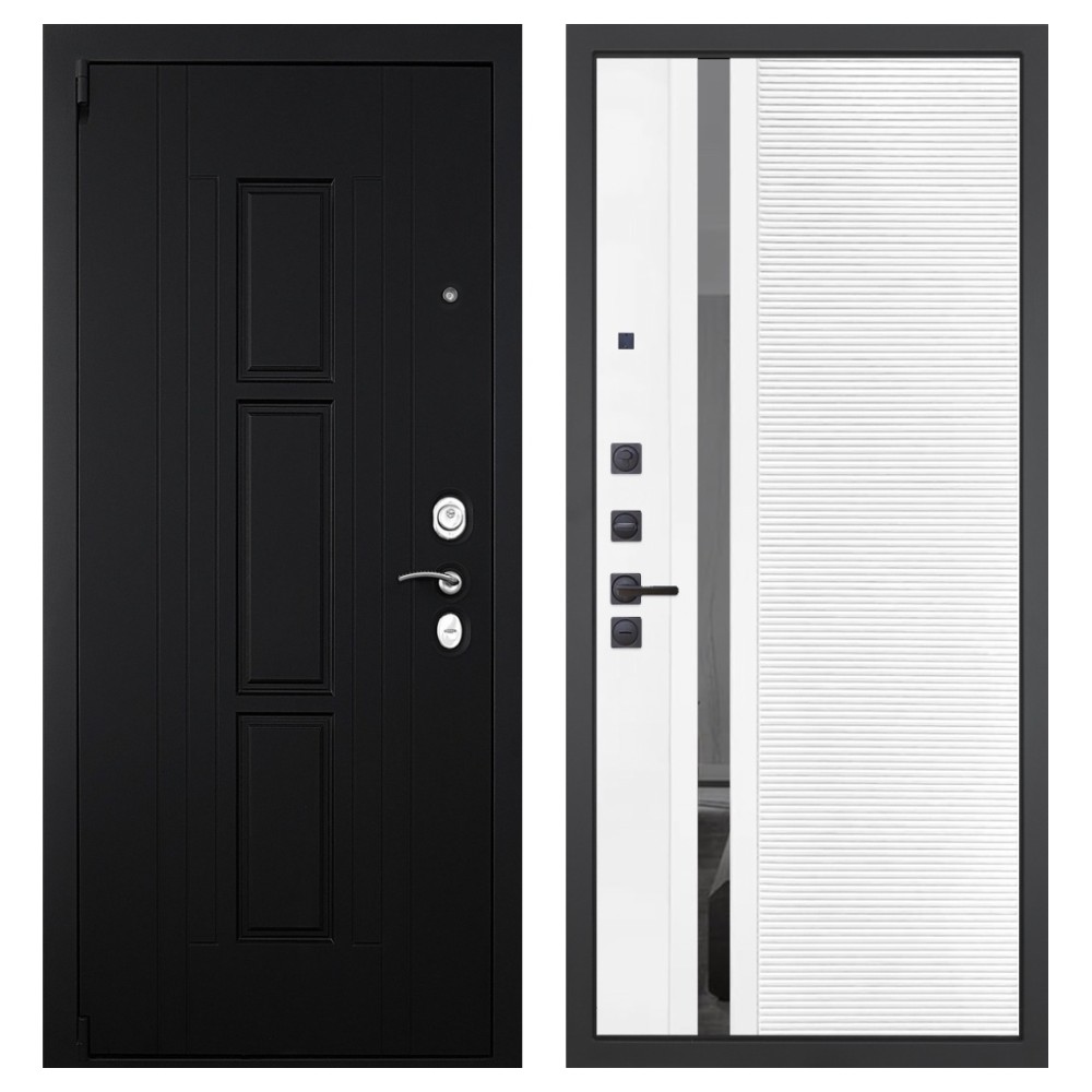 Дизайн и отделка: Металлическая конструкция покрыта прочным полимерно-порошковым слоем цвета «Муар чёрный». Внешняя МДФ-панель «Шагрень чёрная» толщиной 16 мм придаёт двери лаконичный и строгий вид, а два объёмных хромированных логотипа подчёркивают фирменный стиль бренда.