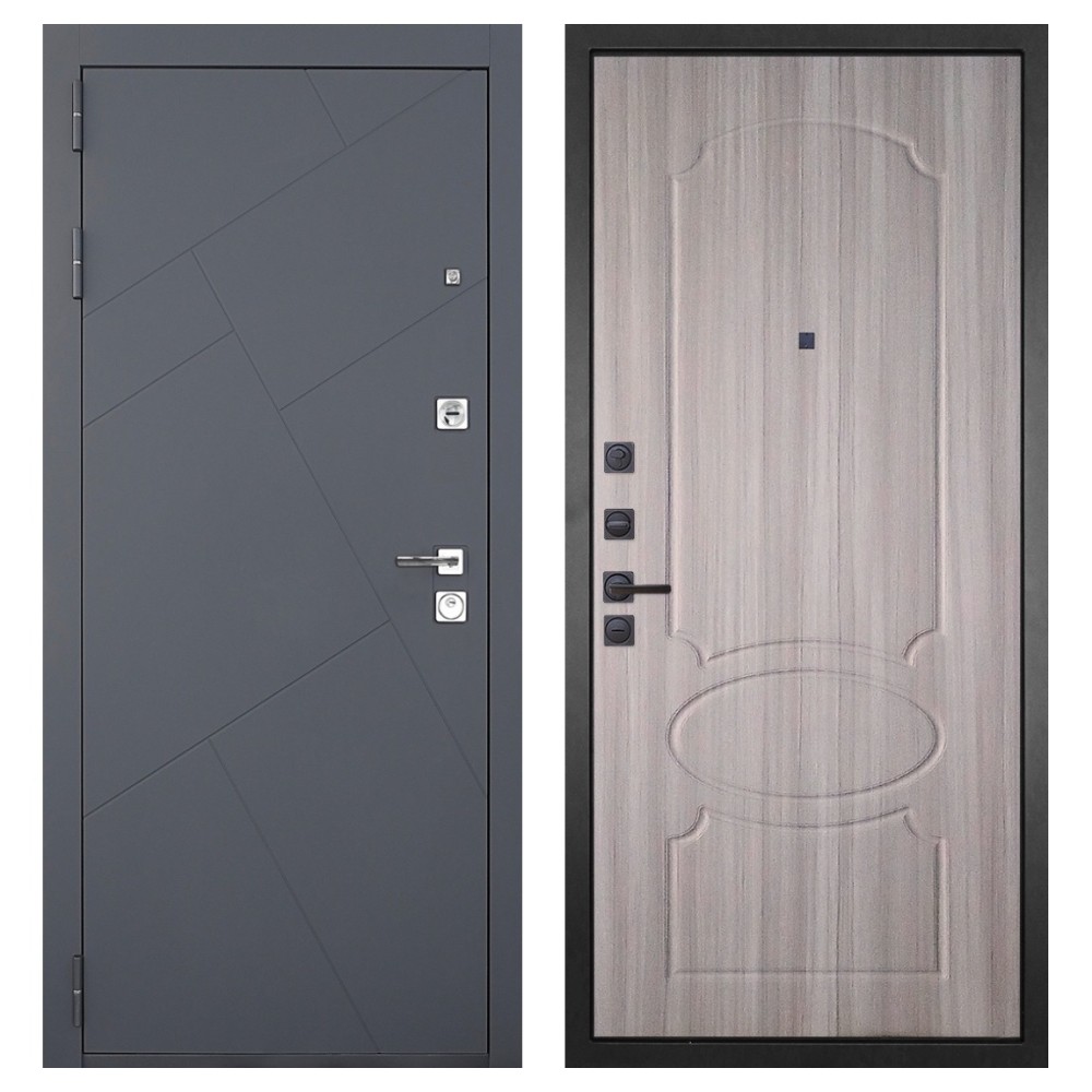 Дизайн и отделка: Металлическая конструкция окрашена в цвет «Серый муар» — прочное полимерно-порошковое покрытие, устойчивое к износу и царапинам. МДФ-наличники и квадратная фурнитура цвета «Хром» создают современный, лаконичный облик.