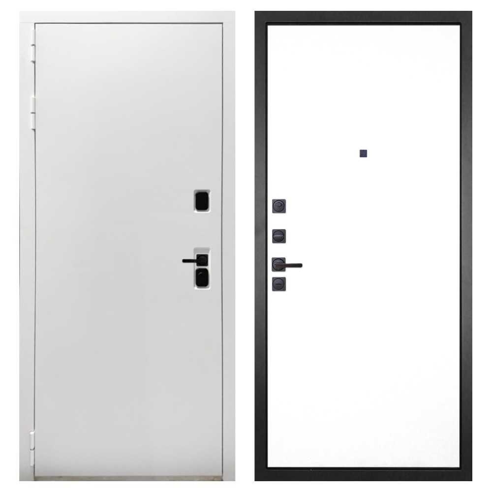 Дизайн и отделка: Белая полимерно-порошковая покраска металлоконструкции устойчива к износу и идеально подходит под интерьер квартиры. Внешняя МДФ-панель и наличники также выполнены в белом цвете, создавая чистый аккуратный вид. Чёрная фурнитура добавляет стильный контраст.