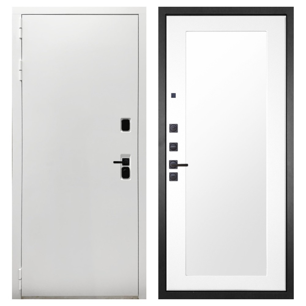 Дизайн и отделка: Белая полимерно-порошковая покраска металлоконструкции устойчива к износу и идеально подходит под интерьер квартиры. Внешняя МДФ-панель и наличники также выполнены в белом цвете, создавая чистый аккуратный вид. Чёрная фурнитура добавляет стильный контраст.